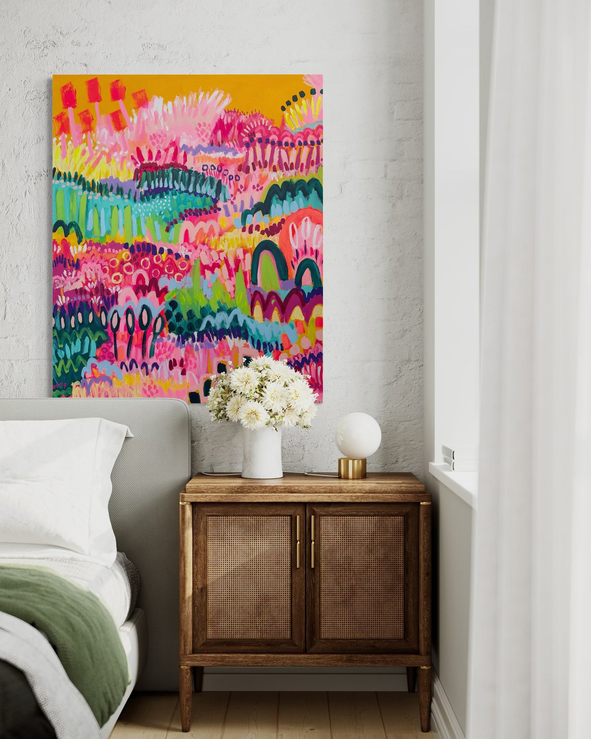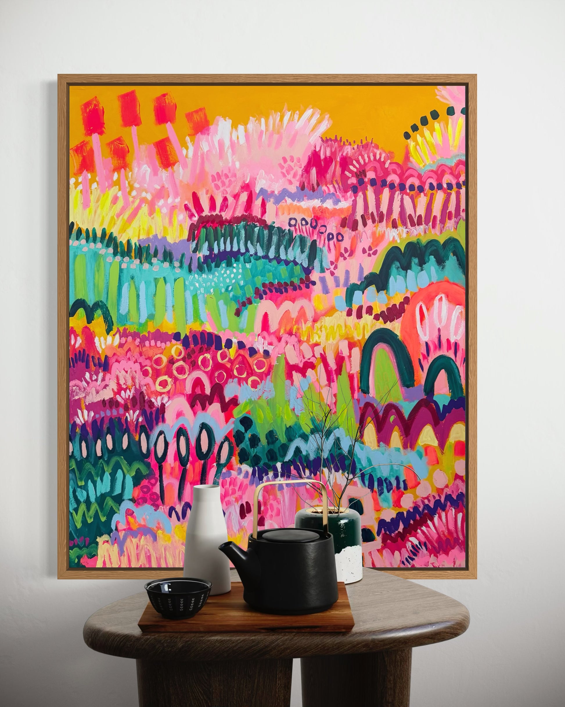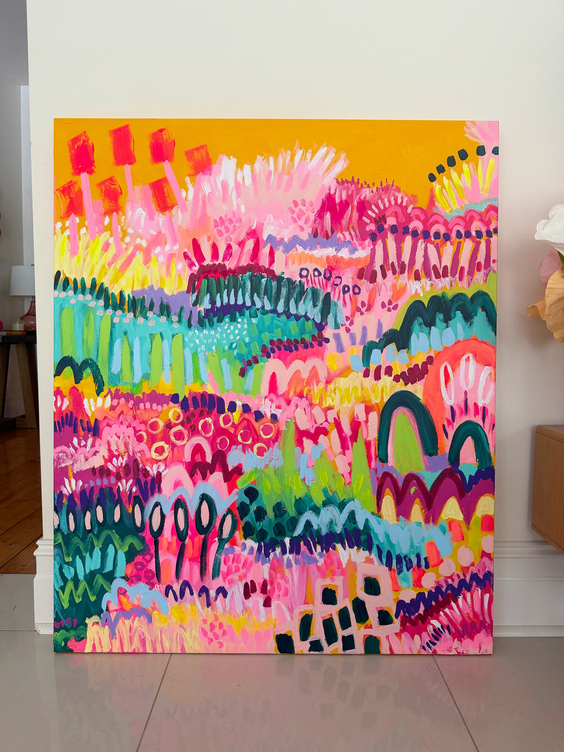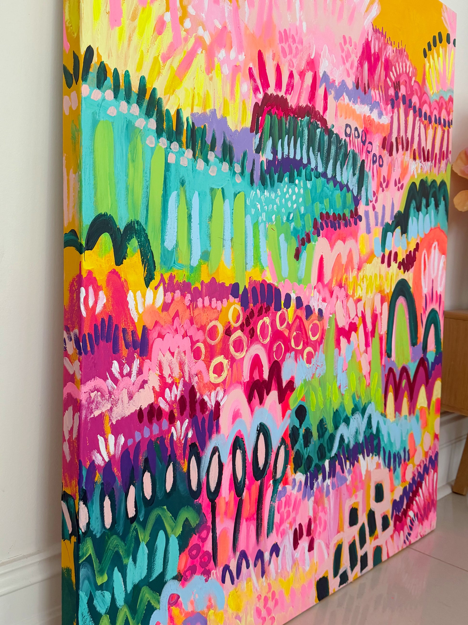 This original Hayley Pearson acrylic on canvas painting celebrates the magic of the Adelaide Hills' beloved Botanic Gardens. Inspired by nostalgic childhood wanderings through autumn-kissed hills, this canvas explodes with neon hues and playful energy