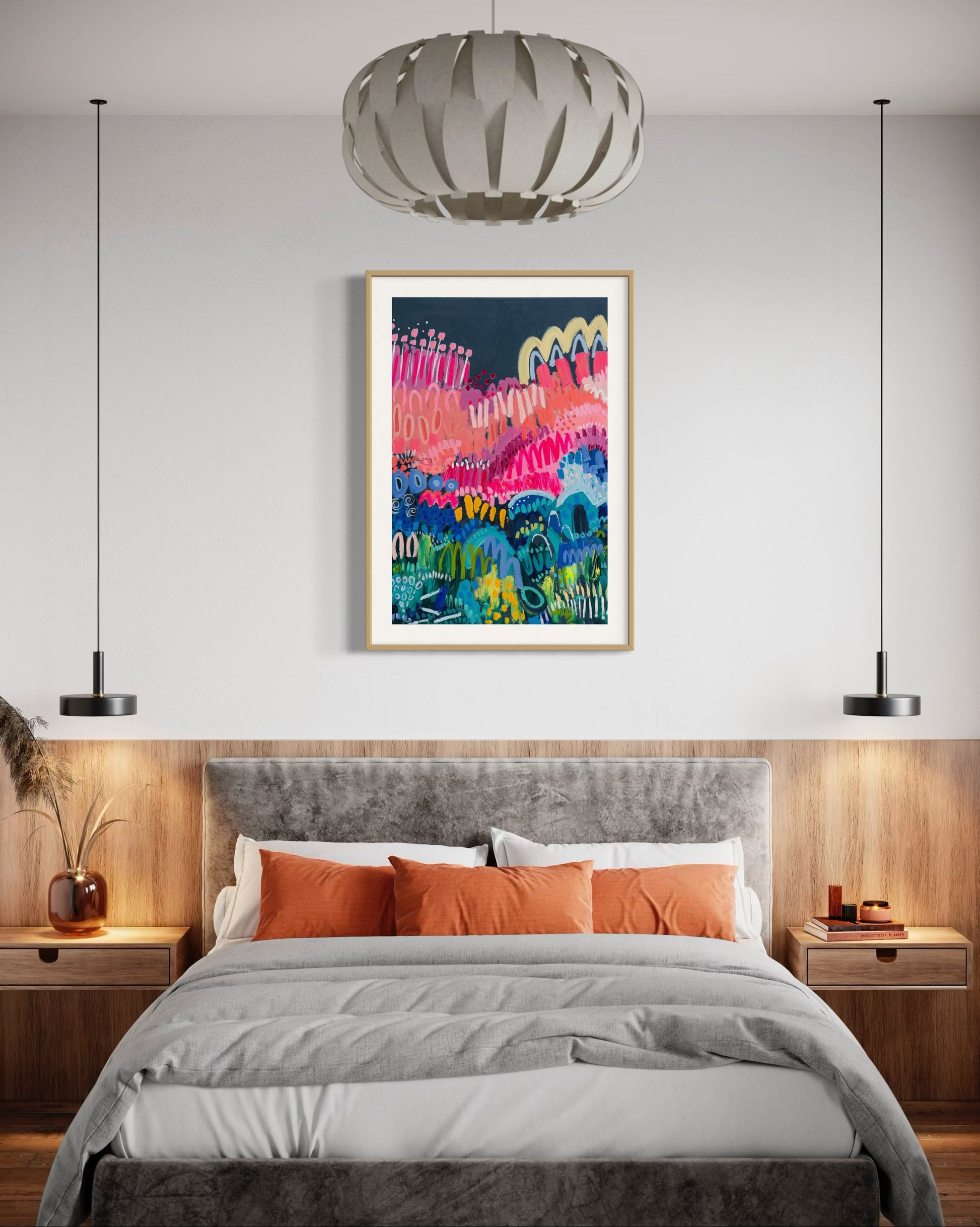 Autumn in the Adelaide Hills… on steroids. Inspired by Mount Lofty Botanic Gardens, this painting explodes with neon pinks, buttery yellows, juicy greens and icy blues. It’s moody, magical, and just the right amount of messy — like Mother Nature.